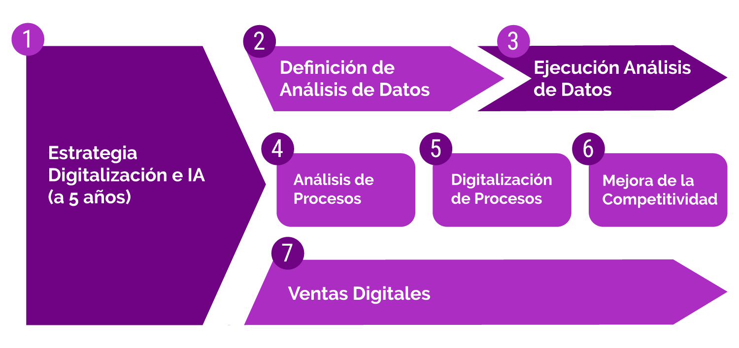 Asesorar para la transformación digital de tu pyme, ofreciendo soluciones adaptadas a tus necesidades específicas. Se definirán la inversión necesaria y las estrategias para aplicar en cada área de impacto, logrando una mejora integral. Además, se utilizarán tecnologías innovadoras como la inteligencia artificial para identificar oportunidades de mejora y optimizar el proceso de transformación digital.